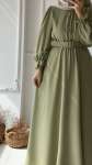 Balon Kol Kemerli Elbise -Haki