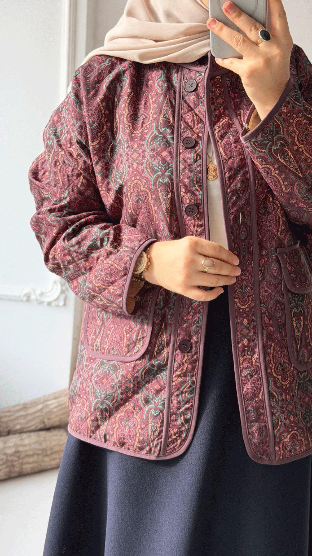 Etnik Desen Kapitone Ceket - Bordo