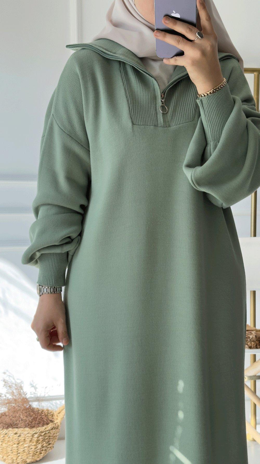 Fermuarlı Triko Elbise - Çağla Yeşili