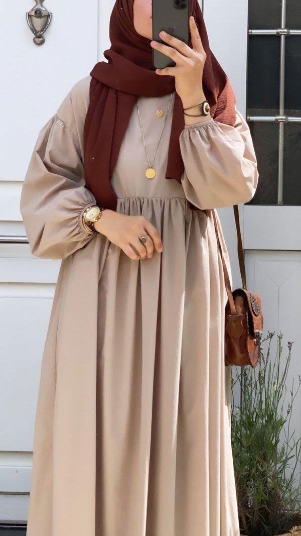 Balon Kol Kemerli Elbise -Kahverengi